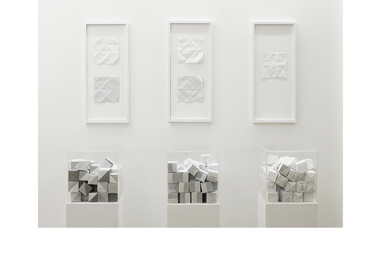 Übergänge 2013 Papier gefaltet in Plexiglaskasten je 20 x 20 x 20 cm, Papier mit Faltspuren je 45 x 20 cm